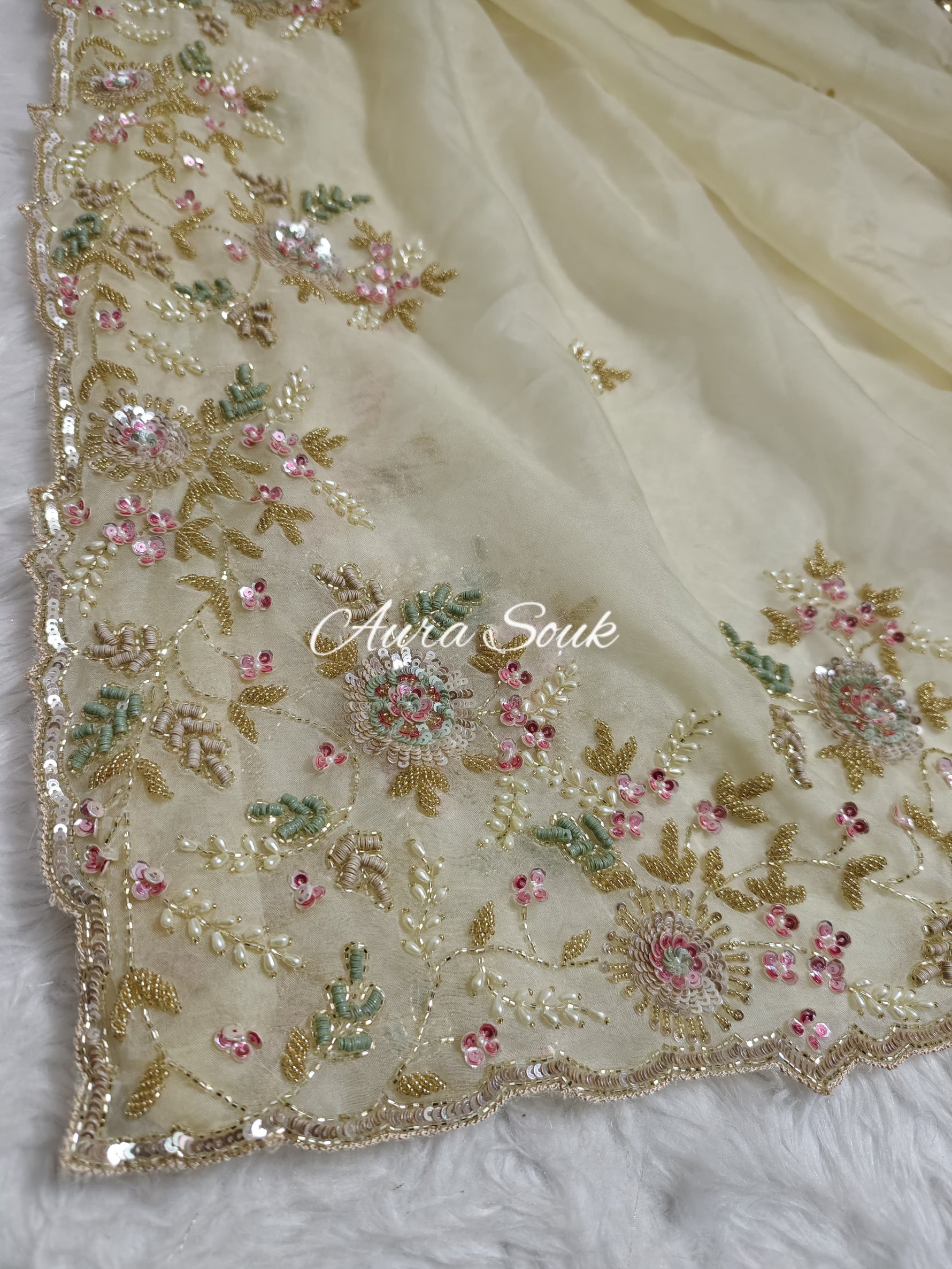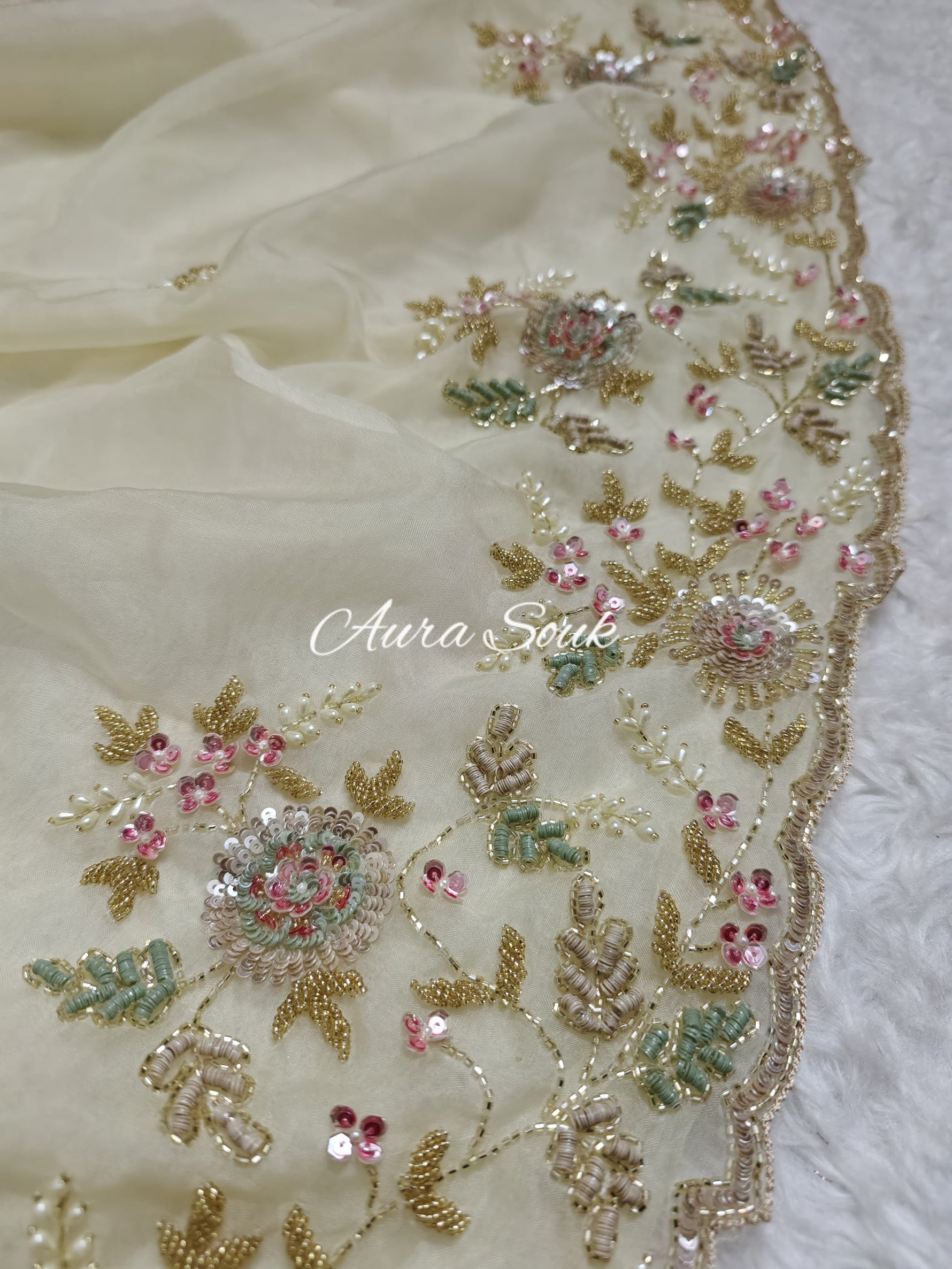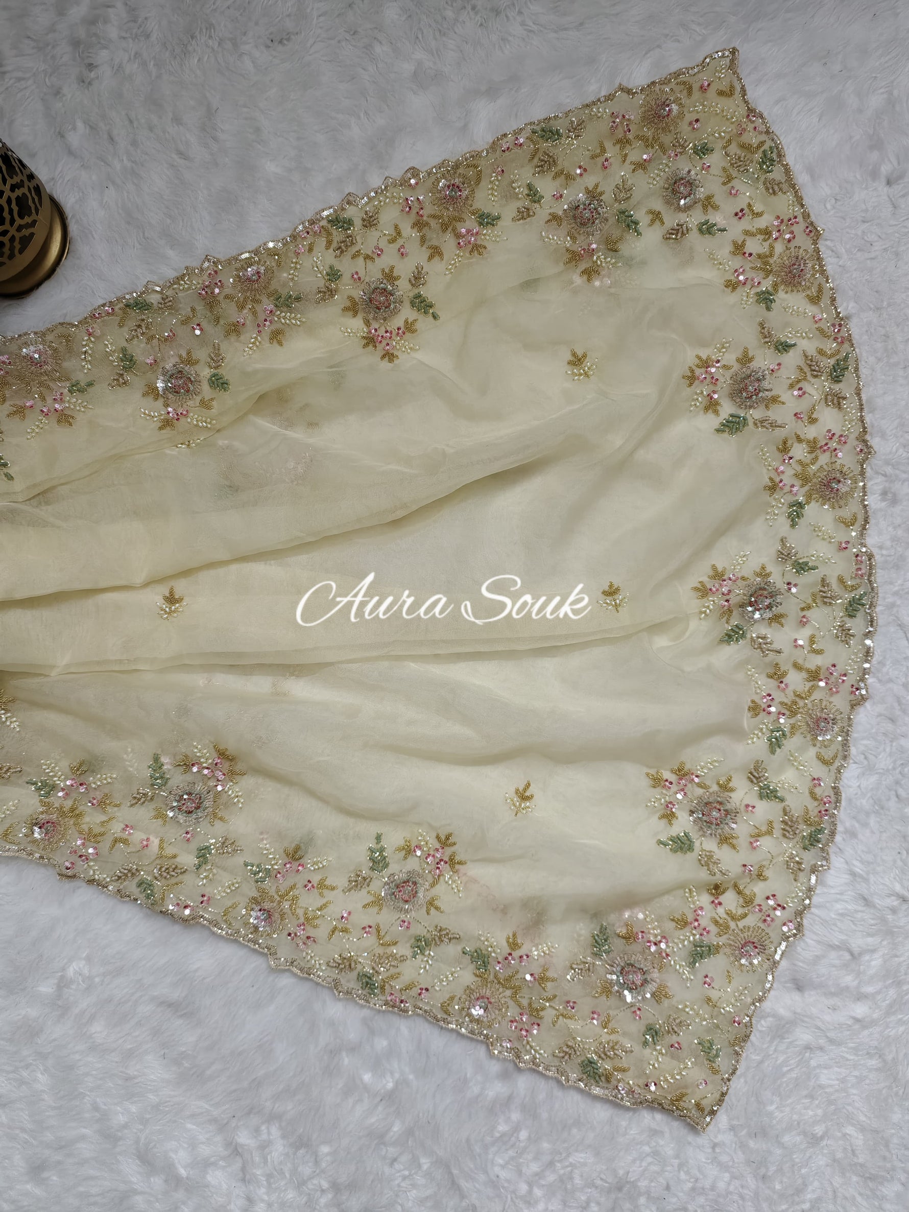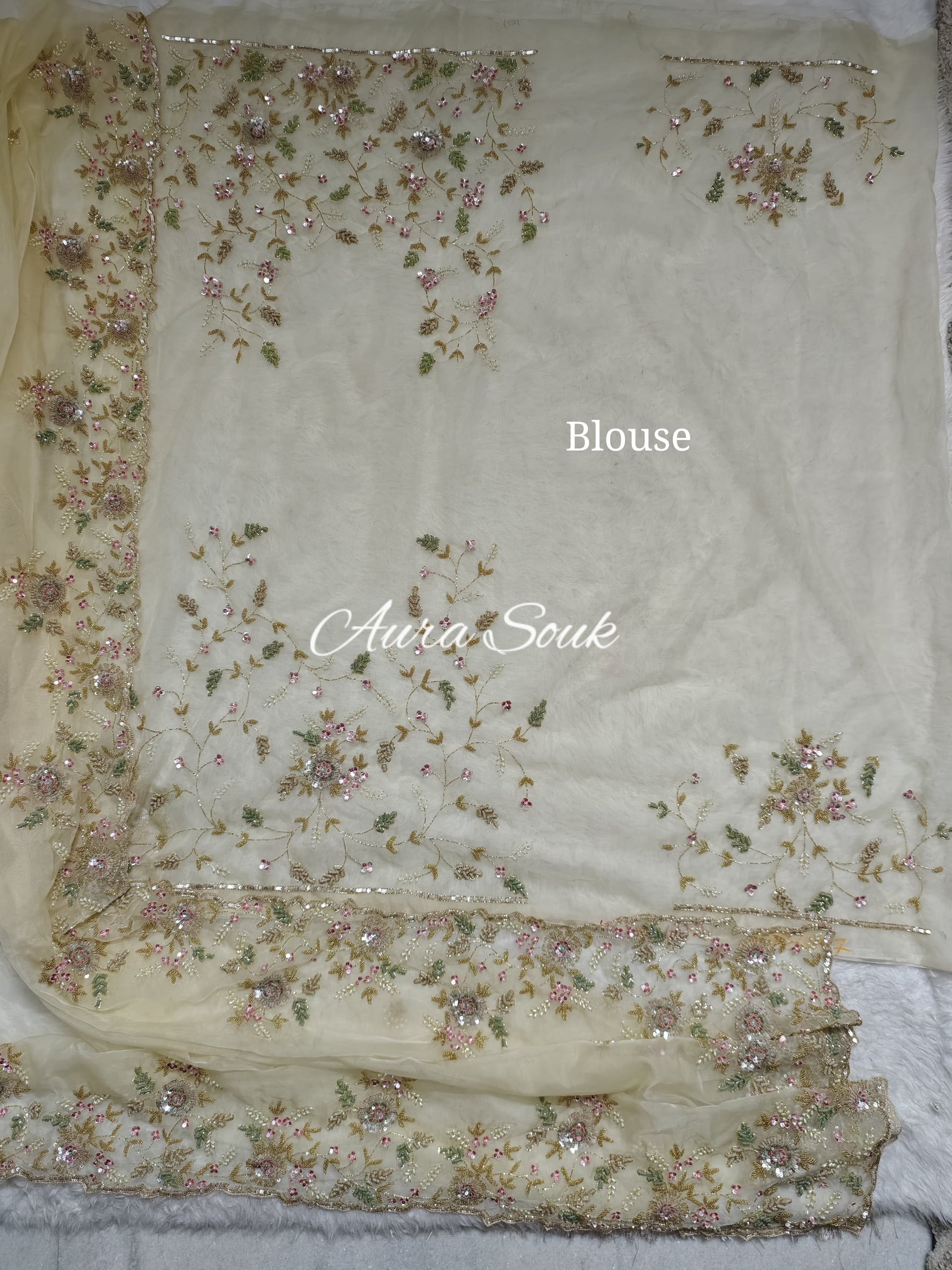 Aura Souk launches in-house design curated with hand done work with beads, pearls, multi colour sequins and cutdana. Fabric is pure satin organza. Blouse is fully worked on back, front and sleeves.