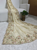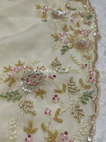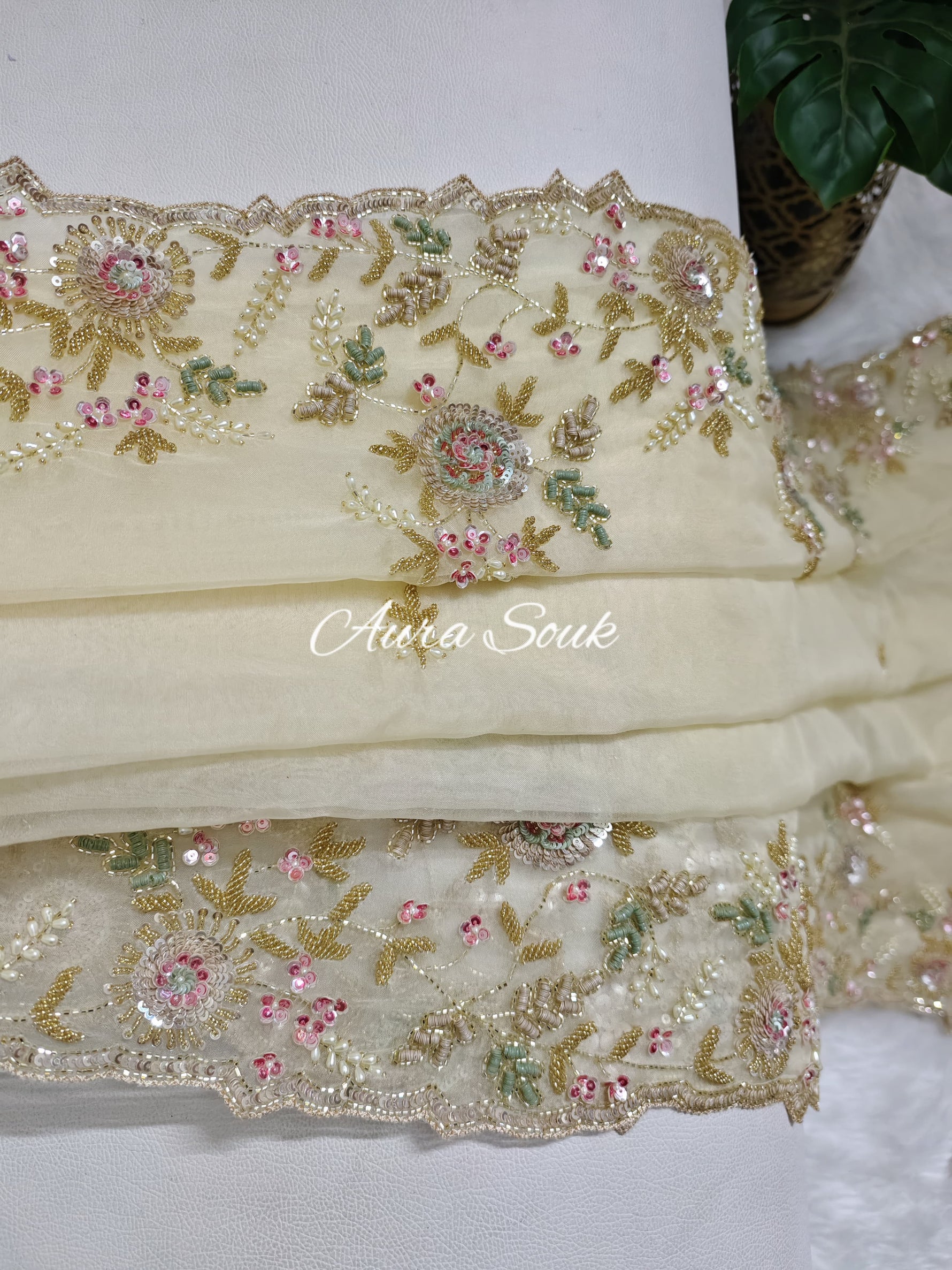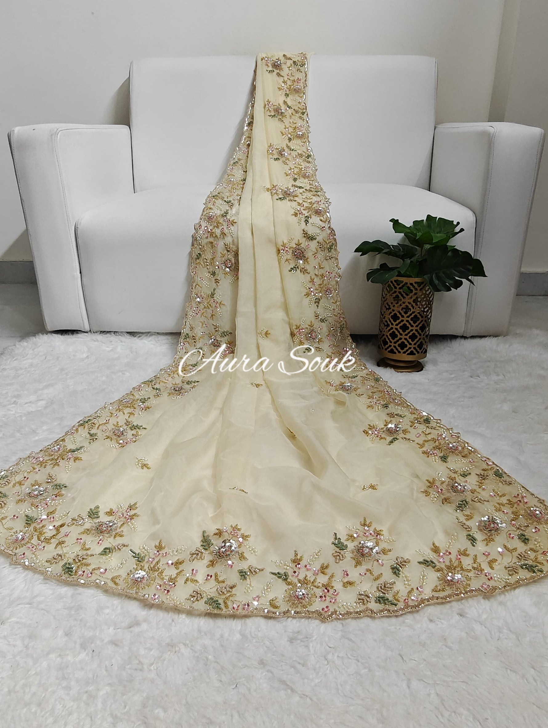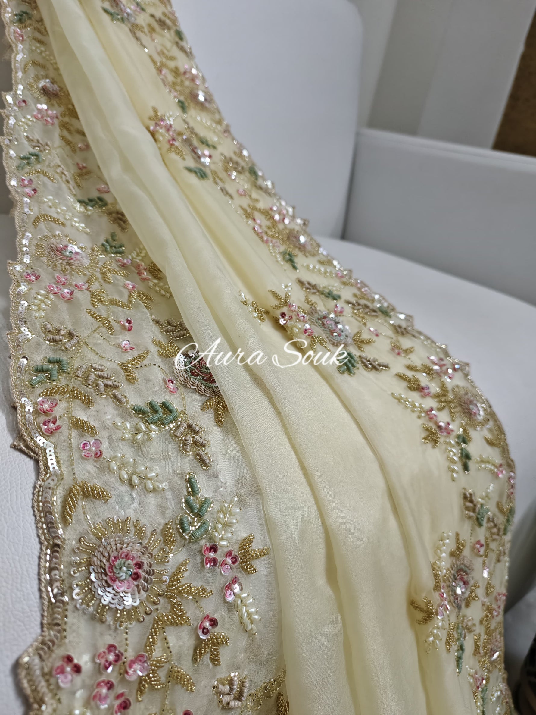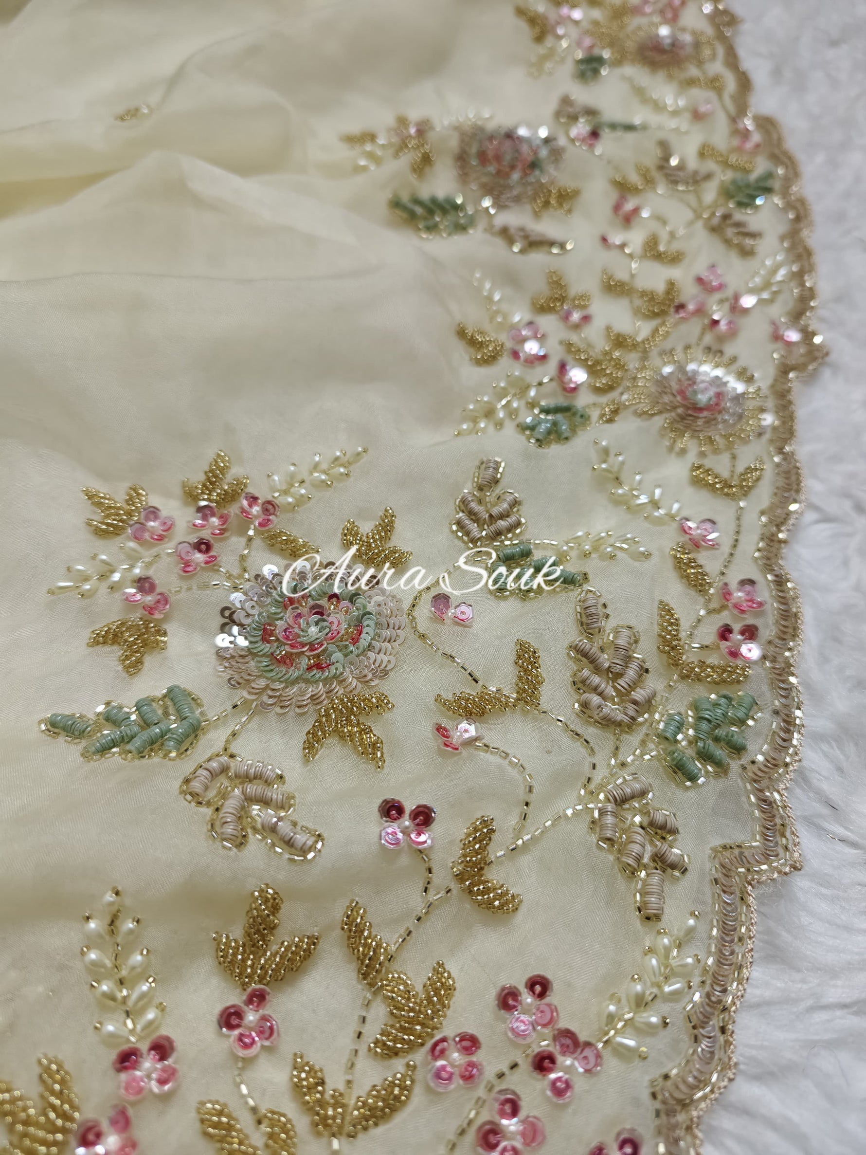 Aura Souk launches in-house design curated with hand done work with beads, pearls, multi colour sequins and cutdana. Fabric is pure satin organza. Blouse is fully worked on back, front and sleeves.